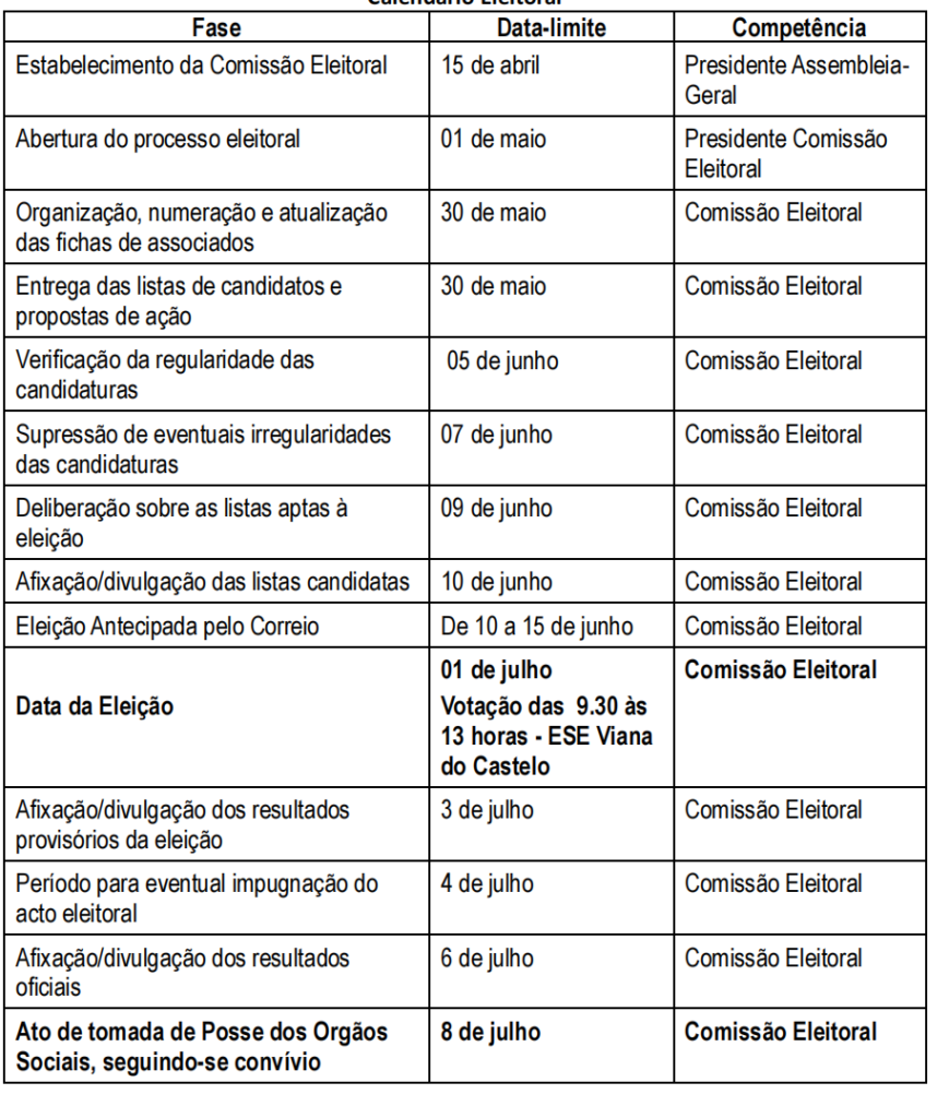 1. As eleições devem ter lugar no dia 01 de julho de 2023, na Escola Superior de Educação do IPVC, sita à Avenida Capitão Gaspar de Castro, 4901-908, Viana do Castelo, das 9:30 às 13:00 horas.